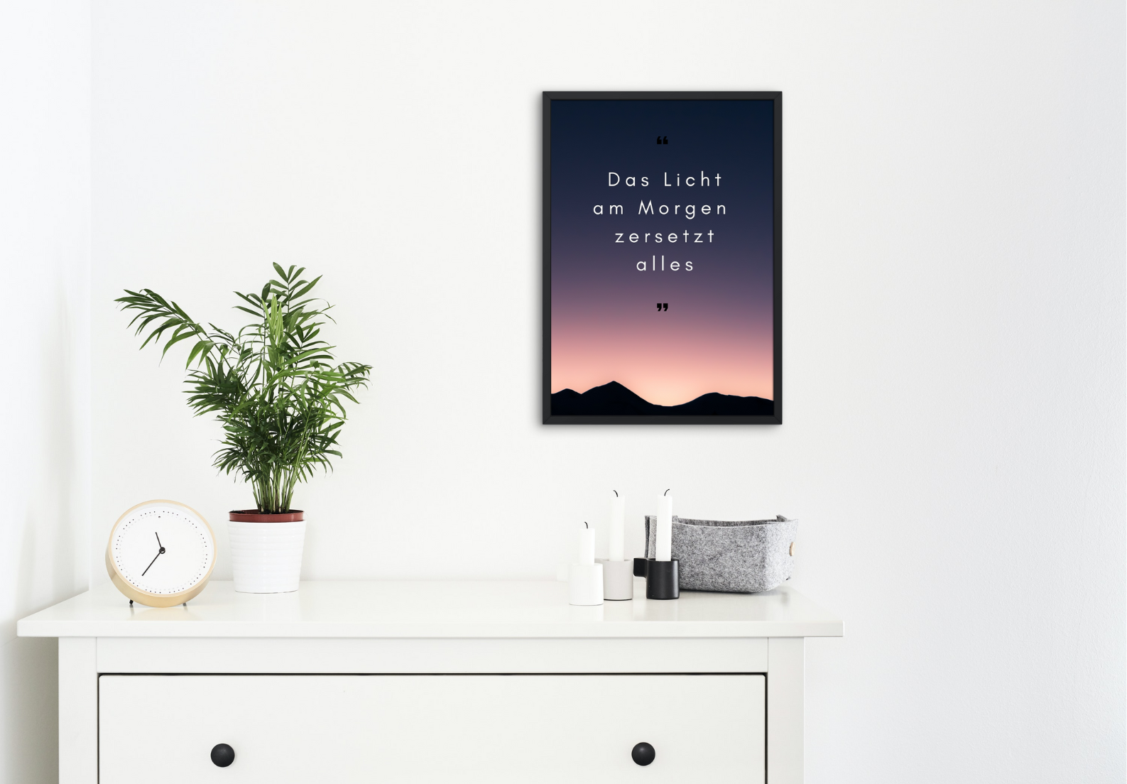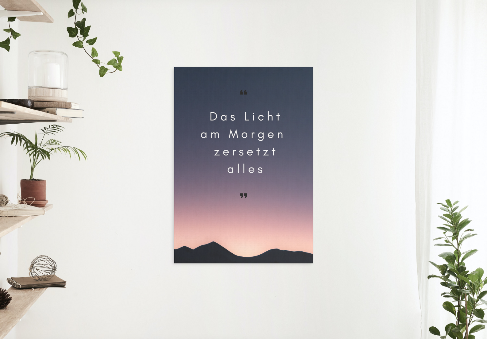 Ein Sprüche-Poster mit "Das Licht am Morgen zersetzt alles". Starte den Tag mit neuen positiven Gedanken und lasse die negativen Gedanken hinter dir.